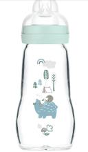 Ce coffret comprend : un biberon en verre 170 ml, 2 biberons en verre de 260 ml et 1 sucette anatomique.