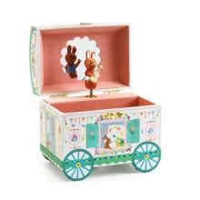 Boîte à musique en forme de roulotte contenant un lapin qui danse au son de la musique « Le temps des cerises » d’Antoine Ronzon.