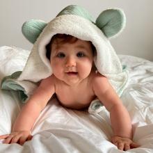 Enveloppez votre bébé de douceur dès la sortie du bain avec la cape de bain bi-matière coton éponge et gaze de coton ★ Certification OEKO-TEX® standard 100 CQ901-3 IFTH