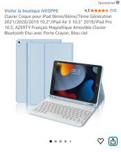 Clavier Coque pour iPad 9ème/8ème/7ème Génération 2021/2020/2019 10.2”/iPad Air 3 10.5" 2019/iPad Pro 10.5, AZERTY Français Magnétique Amovible Clavier Bluetooth Etui avec Porte Crayon, Bleu ciel