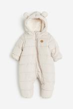 Combinaison en tissu matelassé. Modèle avec capuche fixe agrémentée d’applications en forme d’oreilles sur le dessus. Fermeture à glissière devant, surmontée d’un protège-menton et se prolongeant le long d’une jambe. Bord repliable aux poignets et en bas de jambe pour maintenir les mains et les pieds au chaud. Doublée.