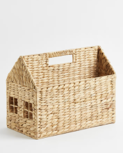 Unité de rangement de livres tressée à la main en paille de jacinthe d’eau sur cadre métallique robuste. Modèle en forme de maison avec poignée en haut. Profondeur 22 cm. Longueur 36 cm. Hauteur 29 cm.