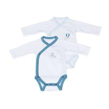 Le lot se compose de deux bodies manches longues aux couleurs douces: deux bodies blanc avec colletage contrasté bleu ciel ou turquoise.