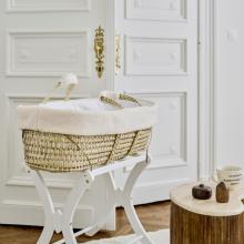 Couffin en osier, habillage en mouton et son socle en bois blanc de chez Théophile et Patachou.