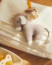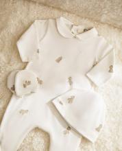 Ensemble de naissance pour bébé. Modèle en jersey de coton orné de motifs en forme d’âne. Comprend une grenouillère, un bonnet et des moufles.