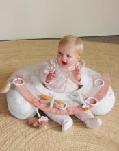 En position d’éveil, couché sur le ventre, bébé est encouragé à lever la tête, stimulé par les différents jouets à sa portée. Les jouets colorés aux formes différentes stimuleront sa vue, son ouïe, le toucher.