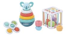La mallette d'activités de Ludi sait comment amuser les petits à partir de 10 mois avec 3 jouets différents : un cube élastique, une pyramide à empiler et une toupie pour bébé. Idéal pour stimuler la motricité fine de votre bébé.