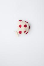 Bonnet en maille crochet avec imprimé cœurs et fermeture à cordons ajustables sur le devant.