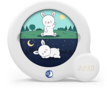 Tant que le lapin n'est pas réveillé, il faut rester au lit. Mais dès que c'est l'illustration du lapin réveillé qui s'allume, les petits savent qu'il est temps de se lever.
