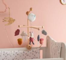 Mobile musical pour éveiller la vue et l'ouïe de bébé, puis l'endormir tout en douceur. Sur une structure en bois, une petite souris danse au milieu de nuages et récoltes de la forêt… avant de rejoindre le pays des rêves.
