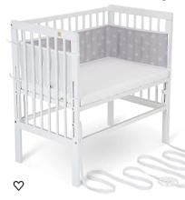 FabiMax Lit d'appoint pour lit à sommier tapissier, réglable en hauteur, en bois de hêtre massif laqué blanc, avec matelas Comfort et tour de lit en filet étoiles blanches sur gris