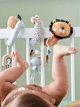 Toujours prête à s'enrouler pour émerveiller les bébés, cette spirale d'activités Tanzanie a plus d'un tour ! En velours tout doux, elle amusera votre enfant grâce à de petits jouets : une feuille, une tortue hochet à billes, un arc-