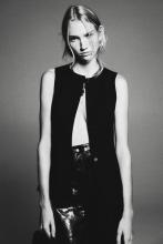 Gilet sans manches long et ajusté en matière tissée. Modèle avec encolure ronde et boutonnage devant. Poches passepoilées devant et fente dans le dos. Doublé.