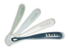 Une cuillère pour... Lot de 4 cuillères ergonomiques d'apprentissage 1er âge Embout silicone : Embout silicone ultra souple, spécialement conçu pour la transition tétine/cuillère Ergonomique : Longueur du manche adaptée à tous les types de pots. Manche long conçu pour une main d'adulte Silicone : Embout et enveloppe intégrale en silicone : nettoyage facilité Souple : Cuillère souple pas de risques de blessure des gencives Entretien : lavage à la main ou lave-vaisselle