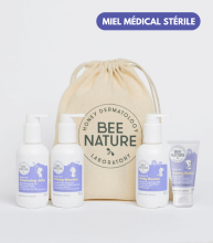 Le Pochon Naissance Babyzz est composé du Gel Lavant Doux Cleansing Jelly, du Lait Corps Nourrissant Body Nectar, du Shampoing Doux Croûtes de Lait Honey Mousse et du Baume de Change Honey Balm. Le tout est présenté dans un joli pochon en coton réutilisable.