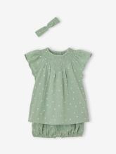 Ensemble en gaze de coton : robe + bloomer + bandeau bébé vert sauge -