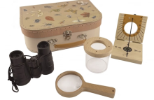 Cette jolie petite valise en carton avec son imprimé insectes contient une vraie paire de jumelles (grossissement x4), une boussole avec cadran solaire en bois, une loupe en bois et une boîte d’observation des insectes. Le kit parfait pour les petits explorateurs en herbe ! Les insectes n’ont qu’à bien se tenir !