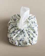 Porte-lingettes confectionné en coton, avec un motif de fleurs bleues et une ouverture centrale froncée par une finition élastique.