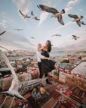 Shooting photo en couple au sommet de la tour de Galata, avec les tapis et les mouettes en décor :D