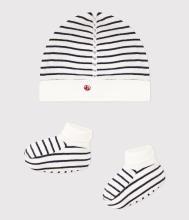Un bonnet et des chaussons confortables en coton, pour garder bébé au chaud en ce début d'été pluvieux.