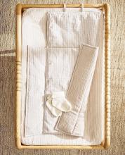 Un tapis délicat par son jeu de matières (une face gaze de coton, une face en jersey côtelé) et par les motifs qui le recouvrent. Son style tendrement scandinave offre beaucoup de douceur à la déco. Bébé pourra s'y
