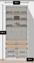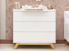 Commode moderne avec une combinaison de bois blanc et naturel. L'aspect lisse est dû aux tiroirs lisses sans poignée. Look scandinave, adapté à une chambre de garçons et de filles. .