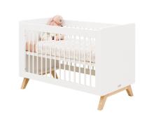 La combinaison du cadre de lit blanc et des pieds en bois de hêtre verni donne au lit bébé Lynn un look scandinave. Le bois est issu de forêts européennes. Les peintures et vernis sont à base d’eau, non seulement sans danger pour les enfants, mais aussi respectueux de l’environnement. La tête et le pied de lit sont en MDF robuste et présentent une finition lisse. La base du lit peut être fixée à deux hauteurs : les premiers mois mettez la en position haute, puis dès que bébé peut se relever en se tenant aux barreaux mettez la base en position basse.