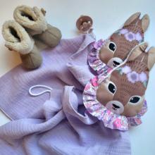Matière: tissu double gaze et fleuri 100% coton, velours minky 100% polyester, passepoil lamé 20%lurex/80%polyester, rembourrage 100%polyester