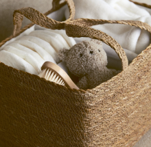 Sac à langer fait main en jonc de mer. Modèle avec deux poignées en haut. Doublure en coton tissé avec plusieurs compartiments pratiques permettant d'avoir le nécessaire à porter de main au moment du change. Hauteur 20 cm. Largeur 25 cm. Longueur 36 cm.