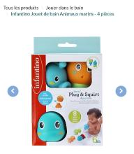 Ces 4 adorables animaux marins sont doux et de taille idéale pour les tout-petits. Bébé peut les remplir d'eau, arroser et surtout s'amuser à l'heure du bain.