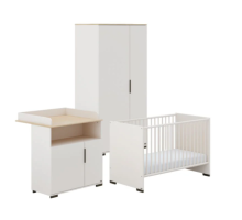 Cette chambre complète comprend un lit bébé, une commode avec table à langer et une armoire deux portes pour ranger toutes les petites affaires (qui sont étonnamment nombreuses pour un si petit humain).