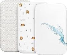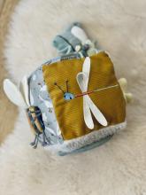 Paniers de rangement matelassés en toile de coton de tailles variées. Modèle avec bord rabattable. Hauteur 12 cm. Largeur 14 cm. Longueur : petit panier 14 cm, grand panier 28 cm.