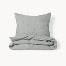 Cette magnifique housse de couette pour lit enfant gris-vert 100% coton bio avec des dinosaures se compose d'une housse de couette et de sa taie d'oreiller. Le drap-housse assorti est disponible séparément. Dimensions : 120x150 cm, taie 50x60 cm.
