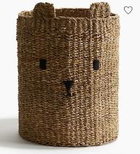 Grand panier de rangement en jonc de mer tressé. Modèle avec broderies devant et applications en forme d’oreilles en haut. Diamètre 33 cm. Hauteur 40 cm.