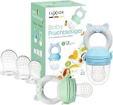 L'ensemble sucette Luxior pour fruits et légumes contient trois attaches en silicone différentes et deux poignées antidérapantes (1x vert, 1x bleu). La sucette Baby Food convient pour les bébés de 3 mois jusqu’aux bébés de 24 mois.