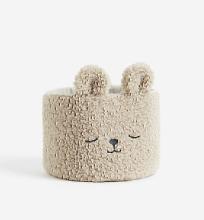 Petit panier de rangement en tissu Teddy bear doux avec applications et détails brodés. Doublé. Hauteur 13 cm. Diamètre 15 cm.