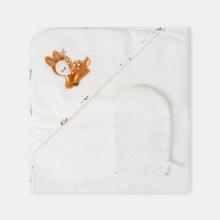 Pointe éponge de 80x80cm Matière principale en éponge de couleur écrue Biais en jersey avec imprimé faons dans les tons caramel et noisette sur fond écru Capuche intégrée en gaze de coton écrue décorée d'un faon en patch velours caramel et écru avec détails brodés Vendu avec son gant assorti avec biais en imprimé faons