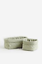 Paniers de rangement matelassés en toile de coton de tailles variées. Modèle avec bord rabattable. Hauteur 12 cm. Largeur 14 cm. Longueur : petit panier 14 cm, grand panier 28 cm.