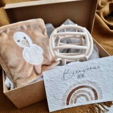 Offrez un joli coffret à bébé pour lui souhaiter la bienvenue. Une attention qui fera plaisir à coup sûr avec un petit mot rédigé spécialement pour l'occasion sur la carte de félicitations "Bienvenue bébé" qui vient compléter votre coffret. Le tout est bien emballé dans un joli coffret prêt à offrir, qui sera lui-même