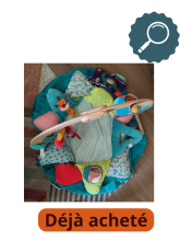 Un tapis et une arche d'éveil achetés en seconde mains. C'est super beau et il y a beaucoup d'éléments avec lesquels interagir.