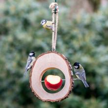 La mangeoire pour pomme Columbus est confectionnée à partir d’un morceau de tronc de bouleau.