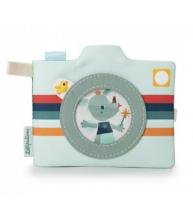 Album photo Lilliputiens en tissus vert en forme d'appareil photo. Prenez la pose et clic ! Dans cet album photo tout doux vous pouvez glisser 10 photos.