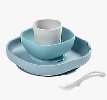 Silicone meal set, consisting of a plate and a bowl with suction cup, as well as a glass and a spoon to accompany Sofia and her parents during their first meals.