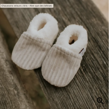 Paire de chaussons gris-beige douillets et chauds en tissu coton nid d’abeille français Rien que des bêtises, souples et élastiqués conçus avec un coton bio et une semelle anti-dérapante en Alcantara, pour le confort de bébé et le raffinement jusqu’au bout des pieds. Idéal comme cadeau de naissance.