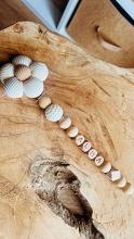 Modèle inédit Clip fleur en tissus, avec perles en silicone et en bois travaillé. Totalement adapté à la dentition de bébé.