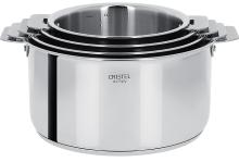 Des casseroles et poêles de différents diamètres avec couvercles et manches correspondants