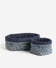 Paniers de rangement matelassés en toile de coton de tailles variées. Modèle avec bord rabattable. Hauteur 12 cm. Largeur 14 cm. Longueur : petit panier 14 cm, grand panier 28 cm.