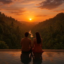 Laisse-toi envoûter par le coucher de soleil sur la vallée du Sayan, où le ciel s’embrase au-dessus de la jungle et la rivière se teinte d’or… Un moment suspendu entre nature, douceur et magie balinaise