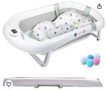 TOUT-EN-UN : Baignoire bébé pliable livré avec coussin de bain et thermomètre digital intégré.