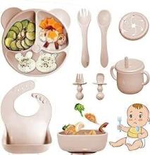 Bizcasa Coffret Repas Bebe 9 pièces, Vaisselle Antiderapant pour Bébé Set Silicone avec Ventouse Assiette Bol Fourche Cuillère Bavoir et Tasse, Assiette Enfant Set, Sans BPA (Beige) : Amazon.fr: Bébé et Puériculture